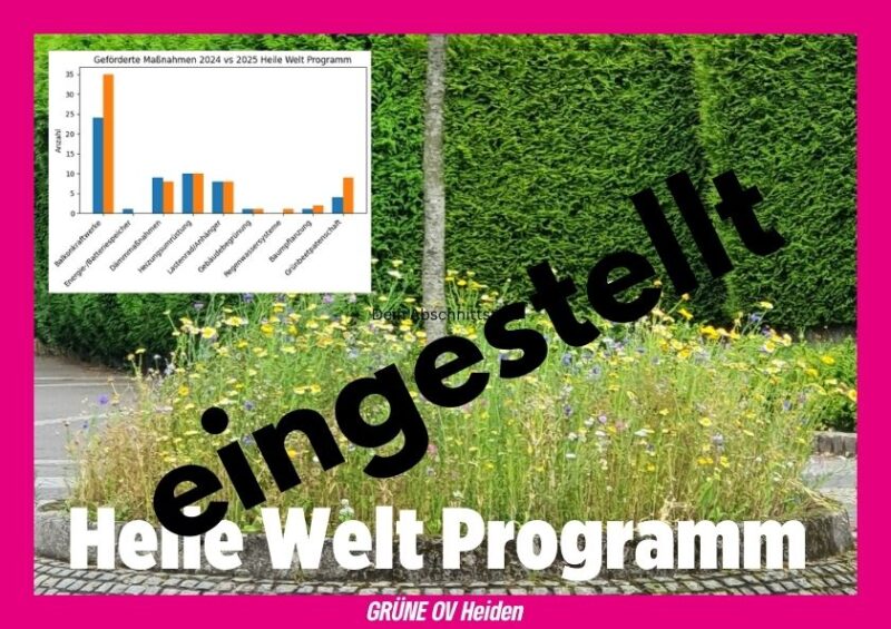 In der letzten Ratssitzung wurde eine Entscheidung getroffen, die wir Grüne zutiefst bedauern: Die Ratsmehrheit aus CDU und UWG hat das kommunale Förderprogramm „HeiLeWelt“ beendet. Damit wird ein etabliertes Instrument abgeschafft, das seit 2019 Bürgern einen direkten Anreiz bot, aktiv am Klimaschutz in unserer Gemeinde mitzuwirken.